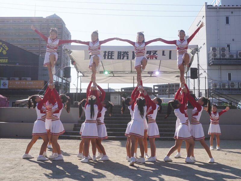 音楽に合わせて様々な技やダンスを披露し、観てくださる方々を巻き込みながら、一緒に盛り上がるパフォーマンスを行っています。