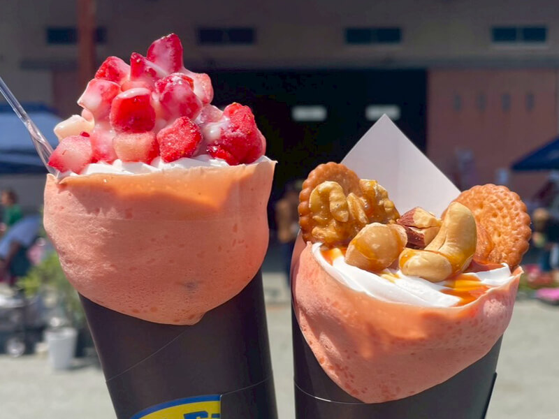 熊本産スーパーフードのビーツ、きび砂糖、北海道産バター、卵屋さんから直接仕入れている新鮮卵をたっぷり生地に使用!栄養満点♪ピンク生地のほんのりあまいフワモチクレープを販売しております。